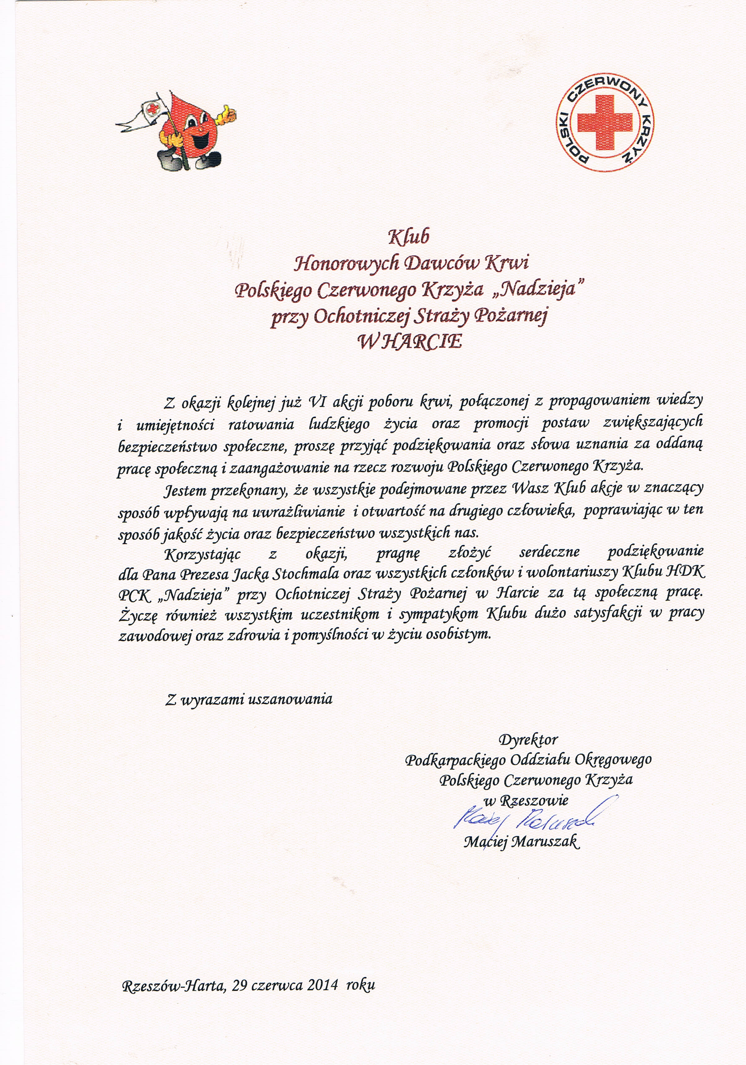 Podziękowania dla Klubu HDK w Harcie